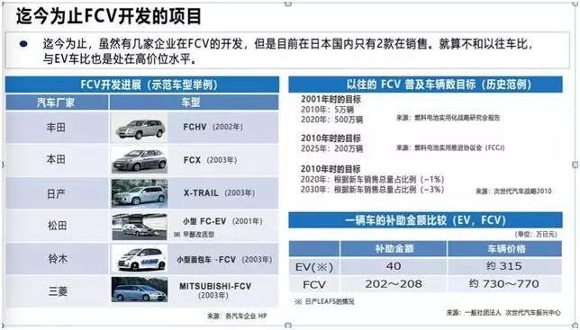 2001年日本提出的目標(biāo)是到2010年燃料電池汽車(chē)?yán)塾?jì)達(dá)到5萬(wàn)輛,2020年累計(jì)達(dá)到500萬(wàn)輛;2010年調(diào)整為2025年200萬(wàn)輛。