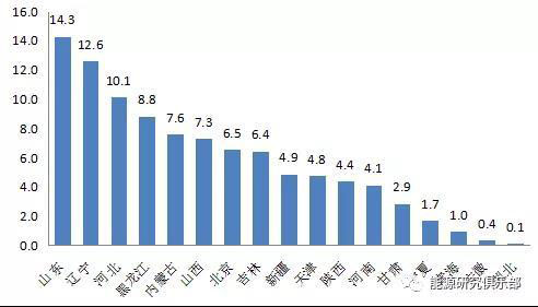 從用熱負(fù)荷看,2017年,全國(guó)城縣鄉(xiāng)總的集中供熱面積為97.9億平方米。其中,城市集中供熱面積為約83.1億平方米,縣城集中供熱面積為14.6億平方米,鄉(xiāng)集中供熱面積為0.2億平方米。分省區(qū)市來(lái)看,熱負(fù)荷主要集中在山東、遼寧、河北,見(jiàn)圖5。