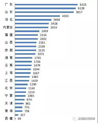 當(dāng)前,綜合能源服務(wù)的開(kāi)展主要以電能為核心,多能耦合。因此,我們重點(diǎn)以電力負(fù)荷分布作為參考依據(jù),結(jié)合熱能、天然氣等能源消費(fèi)情況綜合考慮。根據(jù)全社會(huì)用電量排行榜,2018年,廣東省仍舊穩(wěn)居第一,用電量達(dá)到6323億千瓦時(shí);江蘇省全社會(huì)用電量首次突破6000億千瓦時(shí)大關(guān),達(dá)到6128億千瓦時(shí),成為繼廣東之后全國(guó)第二個(gè)年用電量突破6000億千瓦時(shí)的省份。其次,第二梯隊(duì)的山東、浙江、河南、河北、內(nèi)蒙古用電量均超3000億千瓦時(shí),具體見(jiàn)圖4。僅這前7個(gè)?。ㄗ灾螀^(qū))的用電量就占全國(guó)總用電量的近50%。第三梯隊(duì)的四川、福建、遼寧、山西、新疆、安徽、湖北7省(自治區(qū))的用電量均處于2000億千瓦時(shí)以上。上述14個(gè)省(自治區(qū))全社會(huì)用電量約占總用量的72%,應(yīng)作為重點(diǎn)目標(biāo)區(qū)域。
