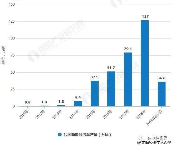 2014年以來,隨著國家相繼出臺政策扶持新能源汽車行業(yè)的發(fā)展,我國新能源汽車市場開始得到迅猛發(fā)展。據(jù)前瞻產(chǎn)業(yè)研究院發(fā)布的《中國新能源汽車行業(yè)市場前瞻與投資戰(zhàn)略規(guī)劃分析報告》統(tǒng)計數(shù)據(jù)顯示,到2018年我國新能源汽車產(chǎn)銷規(guī)模已分別達到127.0萬輛和125.6萬輛,同比分別增長了59.9%和61.7%。截止至2019年4月中國新能源汽車產(chǎn)銷量為10.2萬輛和9.7萬輛,比上年同期分別增長25.0%和18.1%。累計方面,2019年1-4月中國新能源汽車產(chǎn)銷累計達到了36.8萬輛和36.0萬輛,比上年同期分別增長58.5%和59.8%。