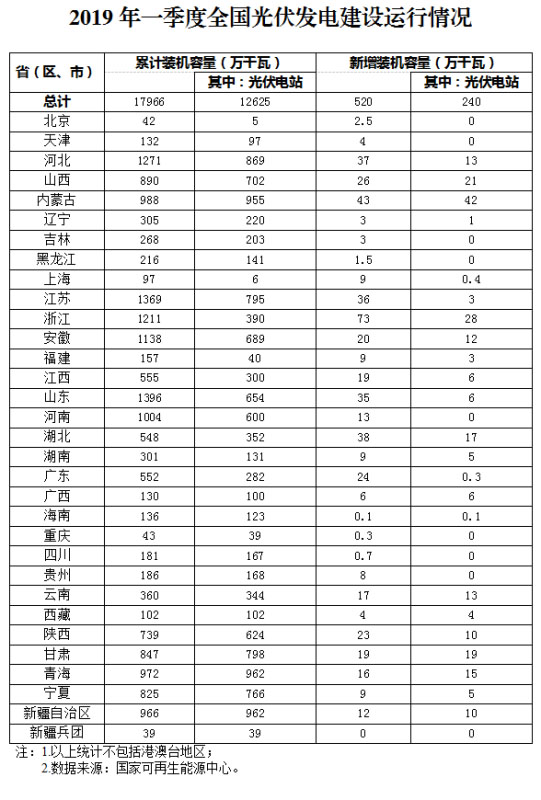 全國各省(區(qū)、市)2019年一季度光伏發(fā)電建設運行情況詳見附表。