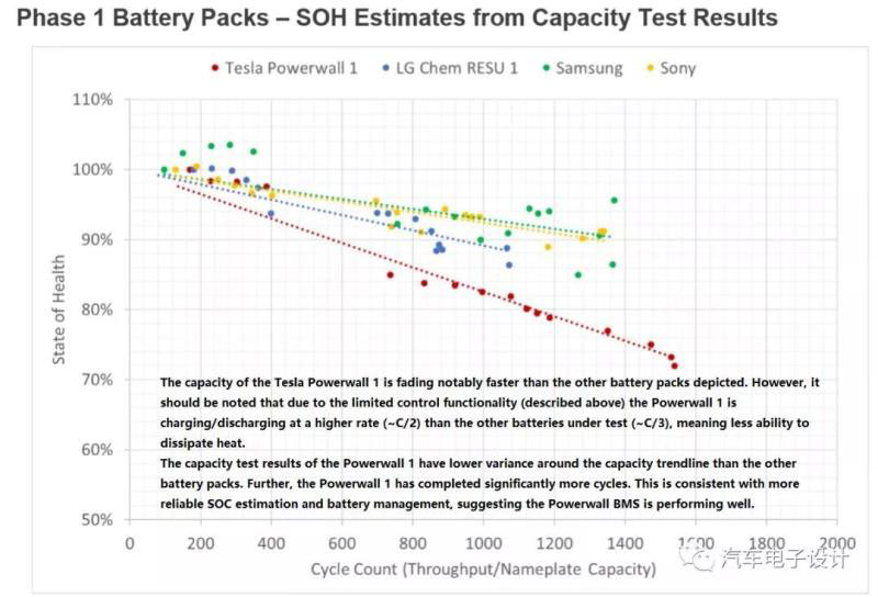 在ITP的《BATTERY TEST CENTRE REPORT 5》里面有使用Tesla的Powerwall來(lái)做壽命分析的數(shù)據(jù),采用C/2的電流進(jìn)行,由于試驗(yàn)周期的問(wèn)題,考慮到整個(gè)車已經(jīng)五年,用日歷壽命一部分這算進(jìn)去,估算整個(gè)實(shí)際的容量已經(jīng)開(kāi)始折損,如下圖所示。