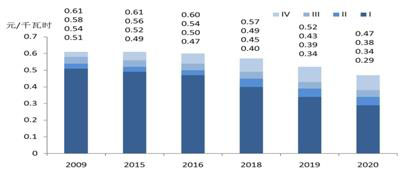 確定陸上風(fēng)電補(bǔ)貼完全退出時(shí)間表。2019年陸上風(fēng)電指導(dǎo)價(jià)標(biāo)準(zhǔn)為每千瓦時(shí)0.34、0.39、0.43、0.52元。2020年為每千瓦時(shí)0.29、0.34、0.38、0.47元,指導(dǎo)價(jià)低于當(dāng)?shù)厝济簶?biāo)桿電價(jià)(含脫硫、脫硝、除塵)的地區(qū),以燃煤標(biāo)桿電價(jià)作為指導(dǎo)價(jià)(圖3)。2021年新核準(zhǔn)陸上風(fēng)電項(xiàng)目全面實(shí)現(xiàn)平價(jià)上網(wǎng),國家不再補(bǔ)貼。