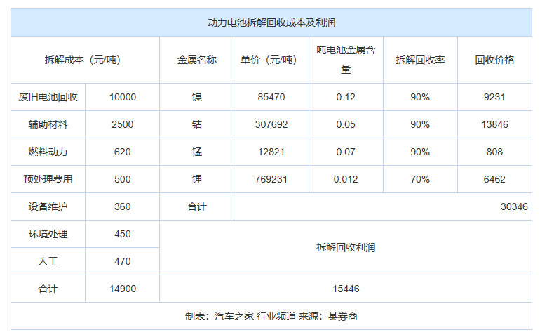 對(duì)于新能源汽車來(lái)說(shuō),電池達(dá)到報(bào)廢條件之后,要么你的車直接被回收,要么你的舊電池被回收。目前還看不到這樣淘汰下來(lái)的廢舊電池值多少錢,但多家券商給電池回收企業(yè)計(jì)算成本時(shí),使用的是10000元/噸的成本數(shù)。