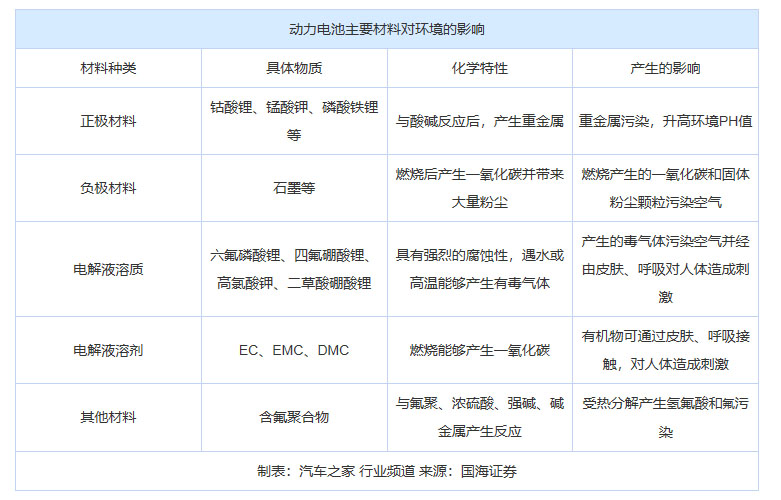 但這種無(wú)污染,當(dāng)然還是相對(duì)而言。奇奇怪怪的各種化學(xué)材料扔到到自然環(huán)境中,降解很難,而且產(chǎn)生其他物質(zhì),對(duì)環(huán)境的危害仍然不小。尤其當(dāng)電池被整塊丟棄的時(shí)候,即使不考慮內(nèi)部物質(zhì)的危害。隨著電動(dòng)車逐步增多,這些電池大磚頭所形成的固體廢物也足夠令人頭疼。下表展示了包括磷酸鐵鋰和三元鋰在內(nèi)的各類電池對(duì)環(huán)境可能帶來(lái)的影響。由此可見,動(dòng)力電池材料的環(huán)境影響不小,治理回收仍然是個(gè)很棘手的問題。