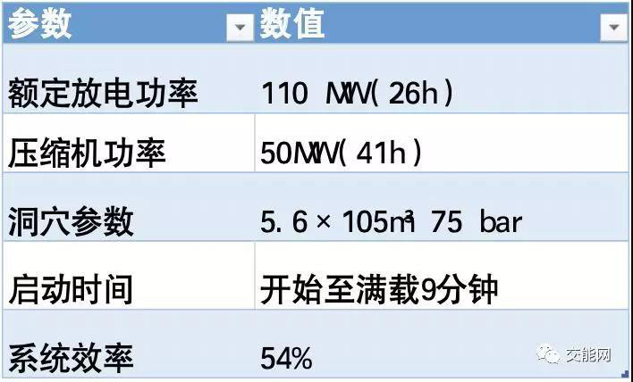 機(jī)組的壓縮機(jī)功率60MW,釋能輸出功率為290MW,最長(zhǎng)額定輸出時(shí)間為2小時(shí)。系統(tǒng)將壓縮空氣存儲(chǔ)在地下600m的廢棄礦洞中,礦洞總?cè)莘e達(dá)3.1×105m3,壓縮空氣的壓力最高可達(dá)10MPa。機(jī)組可連續(xù)充氣8h,連續(xù)發(fā)電2h。該電站在1979年至1991年期間共啟動(dòng)并網(wǎng)5000多次,平均啟動(dòng)可靠性97.6%。電站采用天然氣補(bǔ)燃方案,實(shí)際運(yùn)行效率約為42%,扣除補(bǔ)燃后的實(shí)際效率為19%。