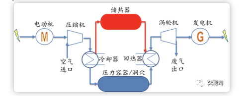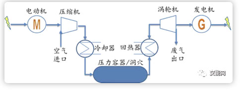 其工作原理是,在用電低谷時(shí)段,利用電能將空氣壓縮至高壓并存于洞穴或壓力容器中,使電能轉(zhuǎn)化為空氣的內(nèi)能存儲(chǔ)起來(lái);在用電高峰時(shí)段,將高壓空氣從儲(chǔ)氣室釋放,進(jìn)入燃燒室燃燒利用燃料燃燒加熱升溫后,驅(qū)動(dòng)渦輪機(jī)發(fā)電。其原理圖如下: