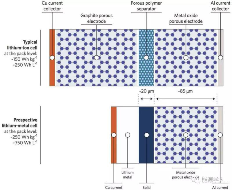 圖9 鋰離子電池(上)和鋰金屬電池(下)示意圖,鋰金屬電池包括1層隔膜和1層致密的金屬鋰。鋰金屬電池處于充電狀態(tài),鋰含量超過20%。層厚按比例顯示。鋰金屬代替石墨電極后,電池體積和質量的減少是很明顯的。鋰金屬電極的另一個概念包括使用宿主結構,該宿主結構限制了鋰金屬電極的體積變化。