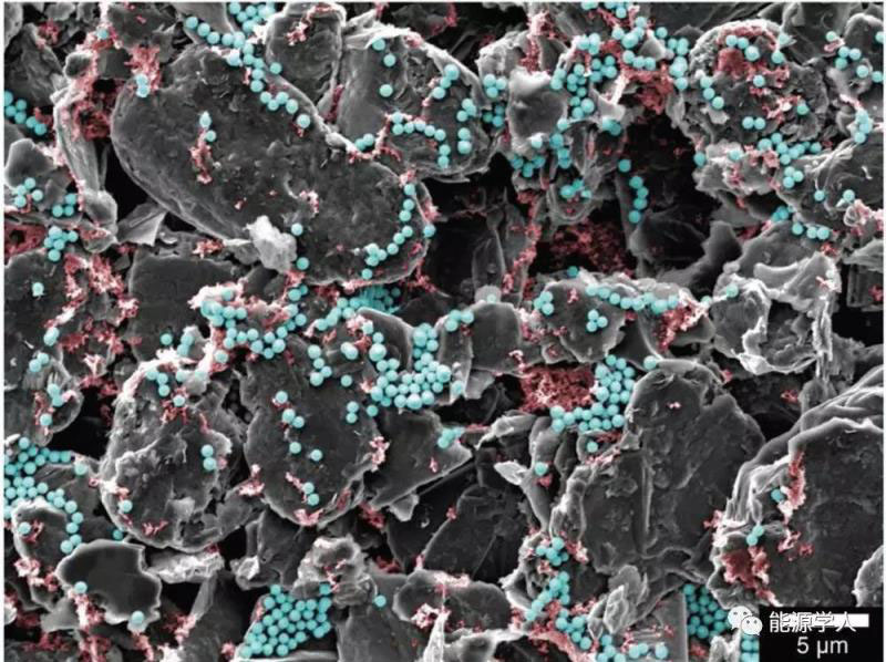 圖8 石墨與石墨間孔隙(紅色)中Si顆粒(藍色)所組成的硅碳結構。