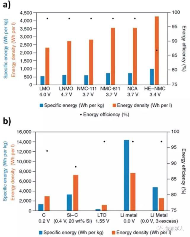圖7 a)正極和b)負極活性材料在材料水平上的比能量,能量密度和平均能量效率。