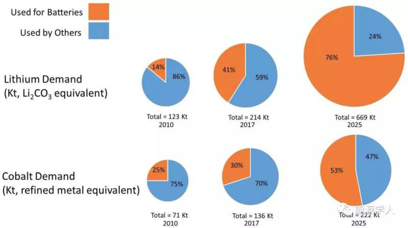 圖4 電池和其他應用對鋰和鈷需求的變化。