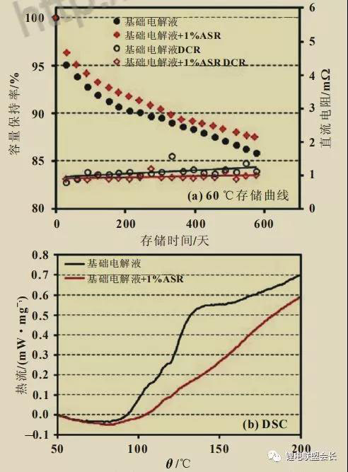 因?yàn)殡姵馗邷卮鎯?chǔ)過程中的容量損失主要來自陽極表面的副反應(yīng)造成的活性鋰離子損失,所以在電解液中添加SEI膜熱穩(wěn)定添加劑(ASR)可以提升SEI膜的高溫穩(wěn)定性,降低陽極表面的副反應(yīng)活性,減少活性鋰離子損耗。