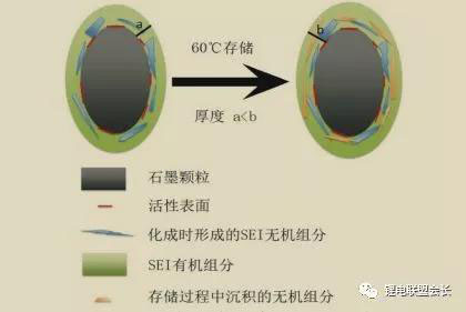 綜上所述,在高溫存儲(chǔ)過程中,嵌鋰態(tài)陽極長(zhǎng)期處于低電位狀態(tài),電解液還原反應(yīng)消耗活性鋰離子,最終生成無機(jī)鋰鹽;高溫增加了電解液還原反應(yīng)速率,使活性鋰離子大量損失(圖6)。此外,陽極副反應(yīng)產(chǎn)物沉積、SEI膜增厚,造成電極動(dòng)力學(xué)性能變差。