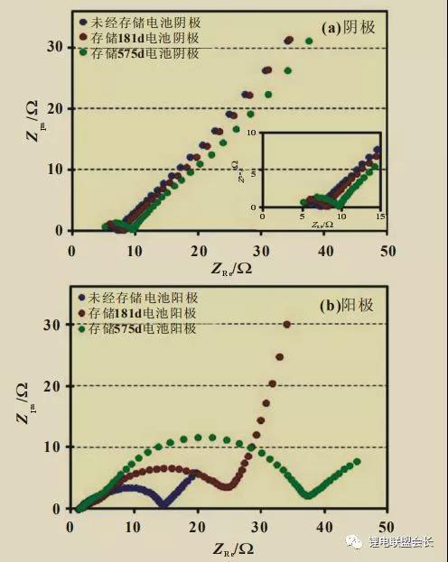 電化學(xué)阻抗譜(EIS)(見圖5)中,雖然陰極Rct隨高溫存儲(chǔ)時(shí)間延長(zhǎng)而增大[圖5(a)],但陰極Rct較小,對(duì)電池內(nèi)阻影響也較小。陽極EIS[圖5(b)]RSEI隨存儲(chǔ)時(shí)間變化不明顯,但Rct隨存儲(chǔ)時(shí)間延長(zhǎng)而顯著增加。由于高溫存儲(chǔ)過程中電解液副反應(yīng)產(chǎn)物沉積于石墨表面,陽極比表面積隨存儲(chǔ)時(shí)間增加而減小,存儲(chǔ)0、181和575d電池陽極比表面積分別為3.42、2.97和1.84cm2/g。陽極比表面積下降使發(fā)生在陽極表面的電化學(xué)反應(yīng)活性減小,導(dǎo)致陽極/電解液表面的電荷轉(zhuǎn)移電阻Rct增大。
