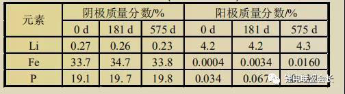 表1為100%SOC電池陰陽極的ICP-OES測(cè)試結(jié)果。陰極中Li含量變化不明顯(~0.25%),陽極的Li含量也維持在同一水平,因此不同存儲(chǔ)時(shí)間電池中陰陽極極片 Li總量基本保持不變。