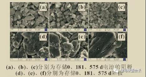 圖3(d),(e),(f)中,存儲(chǔ)181和575d電池陽極首次充電比容量分別為未經(jīng)存儲(chǔ)電池陽極首次充電比容量(304.5mAh/g)的90.4%和84.5%,與實(shí)際電池的容量保持率接近(90.7%和85.8%)。所以,電池容量衰減的主要原因是全電池中活性鋰離子的損失。