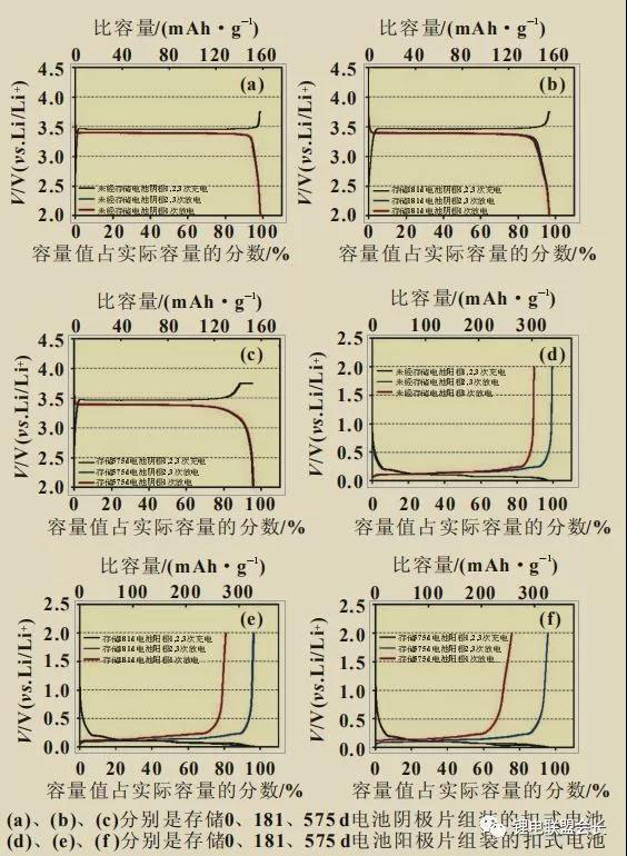 將不同存儲(chǔ)時(shí)間的電池在100%SOC拆解,以其中的極片作為工作電極、鋰片作為對(duì)電極制作扣式電池,以0.1C倍率進(jìn)行充放電測(cè)試(圖3)。