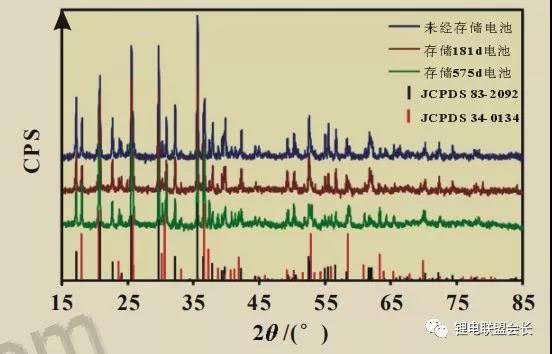 圖 2 不同存儲(chǔ)時(shí)間的電池陰極的XRD譜圖