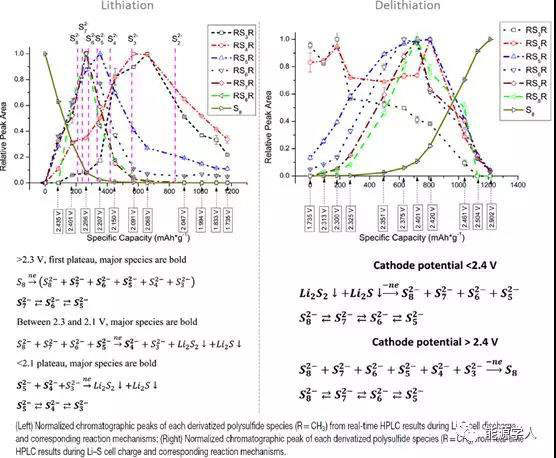 由于鋰-硫體系中的大多數(shù)反應(yīng)都發(fā)生在液相,因此在電池循環(huán)時(shí)能夠跟蹤鋰多硫化物(Li2Sn)至關(guān)重要。在這方面,Dominko和他的同事們已經(jīng)做了大量的工作,他們將Operando紫外-可見(jiàn)光譜技術(shù)作為追蹤和理解中間Li2Sn物態(tài)變化的可靠工具。近年來(lái),X射線吸收近邊緣結(jié)構(gòu)研究已經(jīng)邁出了一步,使人們能夠研究重復(fù)充放電循環(huán)中硫物質(zhì)氧化狀態(tài)的演變。但這項(xiàng)技術(shù)需要同步輻射源,而且多硫化物的亞穩(wěn)態(tài)特性使得對(duì)參考樣品的測(cè)量變得困難,這對(duì)分析和結(jié)果產(chǎn)生了影響。當(dāng)需要選擇表征技術(shù)時(shí),多硫化物的介穩(wěn)性常常受到質(zhì)疑,這就解釋了高效液相色譜法(HPLC)用于分析衍生穩(wěn)定的溶解性多硫化物的原因。因此,提出了詳細(xì)的反應(yīng)機(jī)理,并闡明了每種中間體的作用(圖3)。本研究確認(rèn)了先前報(bào)告的結(jié)論,并提供了一個(gè)更加全面的表述。結(jié)果表明,高鋰化電位平臺(tái)主要?dú)w因于長(zhǎng)鏈多硫化物,S82–、S72–、S62–之間存在一個(gè)元平衡,中鏈Li2Sn(S52–、S42之間的平衡)的電壓降對(duì)應(yīng)于長(zhǎng)鏈的還原,低電位平臺(tái)是Li2S生成前短鏈Li2Sn(S42-和S32-之間的平衡)之間的平衡。在脫鋰過(guò)程,由于S82-、S72-、S62-和S52之間的動(dòng)態(tài)化學(xué)平衡(圖3),結(jié)果不太明顯。Saqib等人基于Operando紅外光譜的得出了類(lèi)似的結(jié)論。此外,他們還發(fā)現(xiàn),聚硫化合物缺乏有序性、濃度的變化以及硫/Li2S復(fù)合困難是導(dǎo)致其長(zhǎng)期循環(huán)性能不佳的原因。