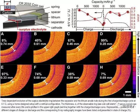 除了X射線衍射(XRD)外,透射電子顯微鏡(TEM)也經(jīng)常被用來(lái)研究鋰-硫電池在循環(huán)過(guò)程中形成的固體產(chǎn)物。但由于進(jìn)行這些測(cè)試所需的高真空條件會(huì)引起電解質(zhì)蒸發(fā),故大部分結(jié)果都是從異位樣品獲得的。當(dāng)樣品在一定的松弛時(shí)間后被檢測(cè)時(shí),不能真實(shí)地反映電池暫停時(shí)的平衡,并被認(rèn)為與其中發(fā)生的動(dòng)態(tài)過(guò)程有關(guān)。然而,盡管存在這些障礙,一些研究小組仍試圖進(jìn)行原位或Operando TEM試驗(yàn),為S8和Li2S階段的結(jié)構(gòu)完整性以及循環(huán)期間發(fā)生的體積變化提供了見(jiàn)解。如前所述,由于高真空環(huán)境,循環(huán)條件與標(biāo)準(zhǔn)條件非常不同。為了在鋰-硫電池中實(shí)現(xiàn)“相位捕獲”,Yang等人電化學(xué)阻抗譜和X射線照相相結(jié)合。由于特殊的Operando裝置能夠同時(shí)滿足這兩種技術(shù)的要求,他們確定了鋰電極周?chē)囊粋€(gè)環(huán),其厚度隨電荷狀態(tài)(SOC)的變化而變化(圖2)。這一觀察結(jié)果與硫化學(xué)的變化直接相關(guān),因?yàn)樵诟唠娢缓偷碗娢黄脚_(tái)的末端分別達(dá)到了極限。