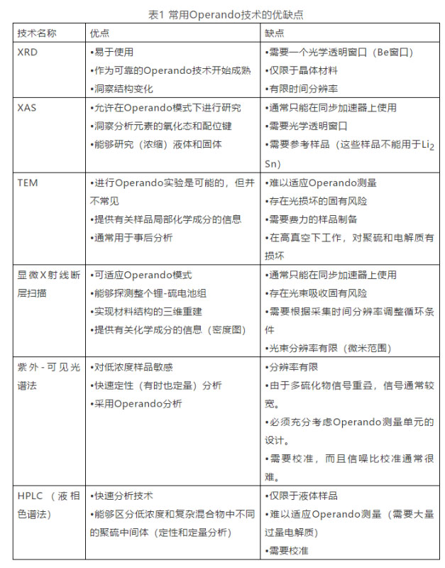 Operando技術(shù)可以回答與Li-S反應(yīng)機(jī)制有關(guān)的不同問(wèn)題。表1總結(jié)了最常用的Operando技術(shù)的優(yōu)點(diǎn)和缺點(diǎn)。