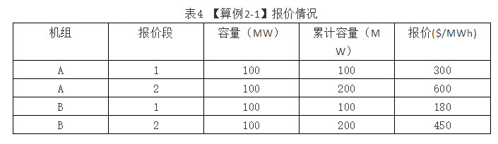 【算例2-1】?jī)膳_(tái)機(jī)組A和B,額定容量均為200MW,各分為兩段,每段100MW,機(jī)組A的兩段報(bào)價(jià)分別為300¥/MWh和600¥/MWh,機(jī)組B的兩段報(bào)價(jià)分別為180¥/MWh和450¥/MWh。具體如表4所示。