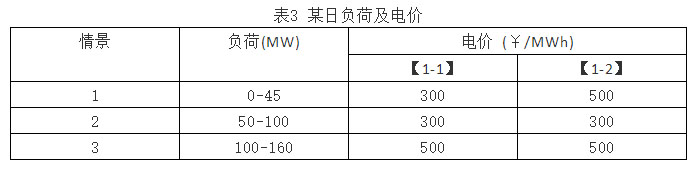假設(shè)現(xiàn)貨市場(chǎng)中,機(jī)組G1和G2的報(bào)價(jià)均等于實(shí)際的成本。也就是說(shuō),每個(gè)電廠申報(bào)一段報(bào)價(jià),申報(bào)數(shù)量分別為100MW和60MW,申報(bào)價(jià)格分別為300¥/MWh和500¥/MWh?!舅憷?-1】下沒(méi)有啟停費(fèi)用,【算例1-2】下機(jī)組G1申報(bào)10萬(wàn)元的啟停費(fèi)用。從分析可以知道,系統(tǒng)的實(shí)時(shí)電價(jià)與系統(tǒng)負(fù)荷的關(guān)系與圖2一致。表3給出了在不同負(fù)荷區(qū)間分別按【算例1-1】和【算例1-2】計(jì)算得到的實(shí)時(shí)電價(jià)。
