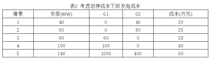 從上面的分析看到,考慮啟停成本時(shí),系統(tǒng)的邊際成本曲線隨負(fù)荷的增長(zhǎng)不再是單調(diào)遞增的曲線,在50MW時(shí)邊際成本下降,到100MW以后又上升。