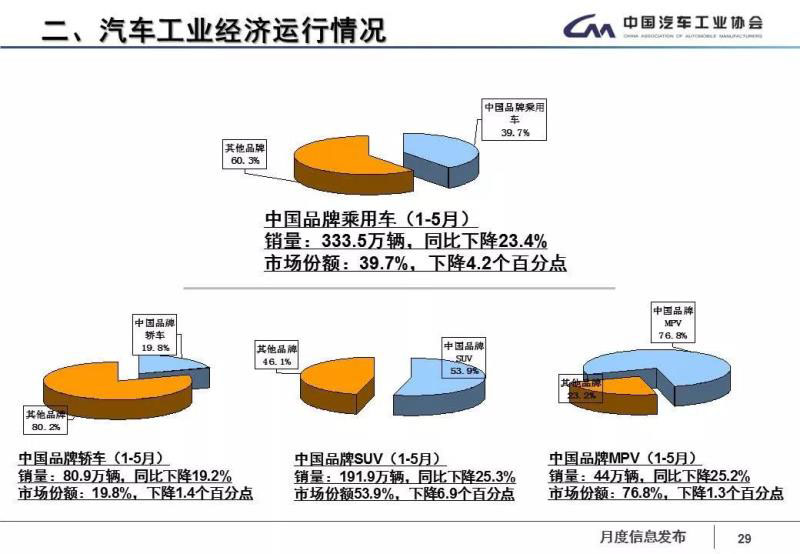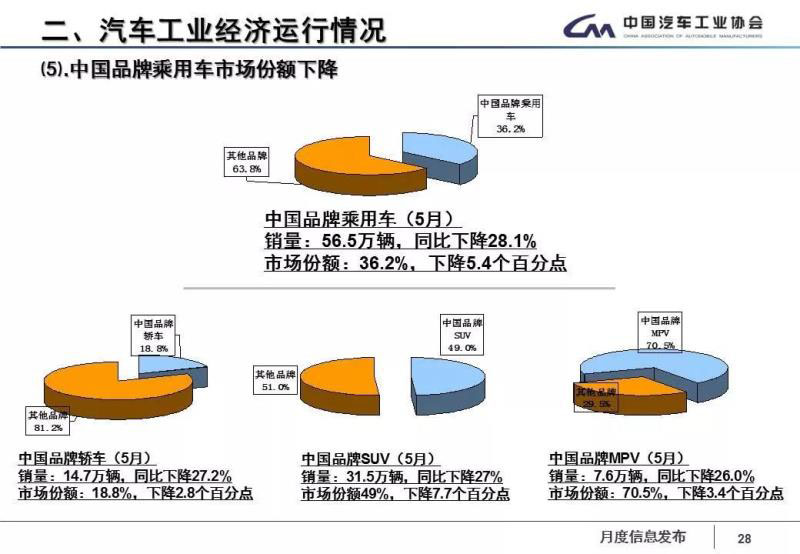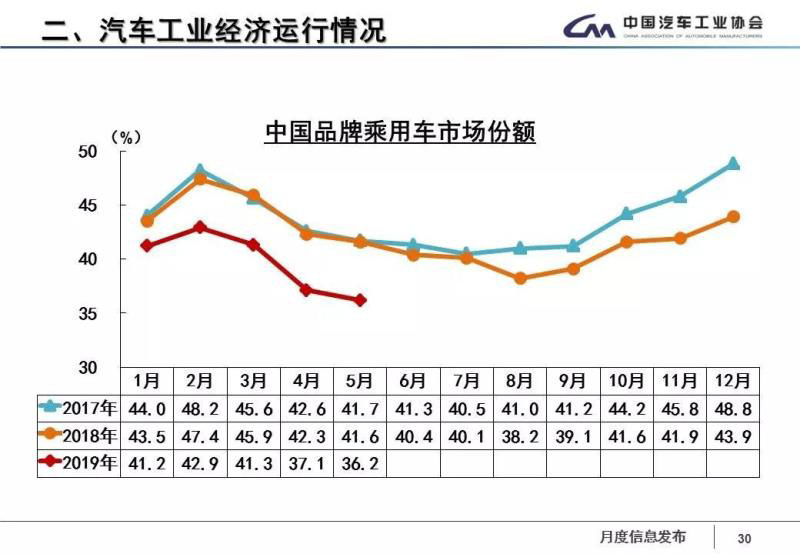 在今年4月份,中國(guó)品牌乘用車市場(chǎng)份額已經(jīng)降到2017年以來(lái)的最低值。到了5月份,中國(guó)品牌乘用車市場(chǎng)份額依舊在降低。