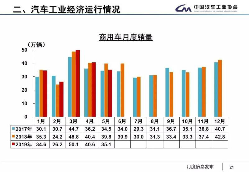 5月產(chǎn)銷整體下降的趨勢(shì)沒(méi)有得到有效緩解,一方面是因?yàn)橄M(fèi)動(dòng)能沒(méi)有得到有效提升,另一方面生產(chǎn)企業(yè)也在主動(dòng)放慢產(chǎn)銷節(jié)奏,減輕終端市場(chǎng)壓力。根據(jù)中國(guó)汽車工業(yè)協(xié)會(huì)秘書長(zhǎng)助理許海東的分析,目前經(jīng)濟(jì)型群體的購(gòu)買力在下降,而由于國(guó)五和國(guó)六的切換,經(jīng)濟(jì)發(fā)達(dá)地區(qū)有能力換購(gòu)的消費(fèi)者還在觀望。造成商用車銷量下滑的原因,除了客車的大幅下降造成的影響之外,具體的原因還需要進(jìn)一步觀察。