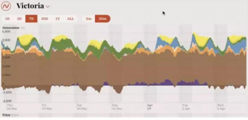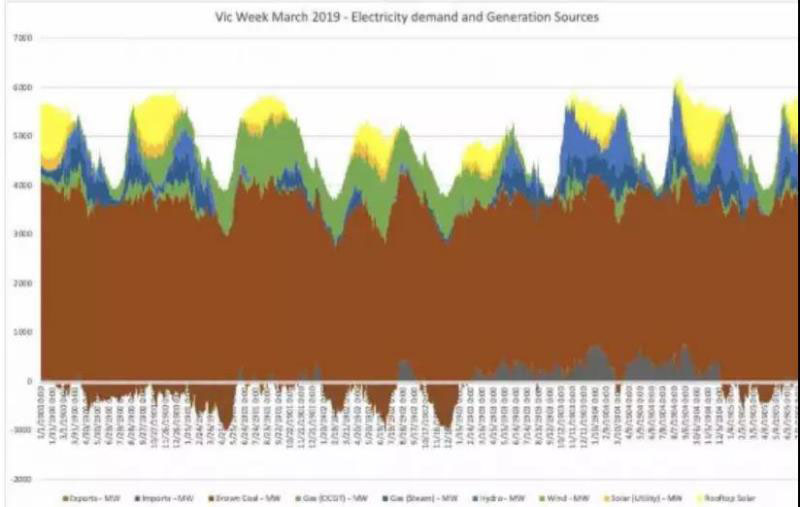 以下截圖來自opennem.org.au,內(nèi)容是維多利亞3月份發(fā)布的一周的“各類電源發(fā)電和用電需求圖”。在圖中可以看出,大部分電力來源于褐煤發(fā)電;還有部分來源于風(fēng)力發(fā)電(綠色區(qū)域),屋頂光伏發(fā)電(黃色區(qū)域)和光伏發(fā)電(橙色區(qū)域);另外, 在風(fēng)力比較弱時(shí),對于水力發(fā)電(藍(lán)色區(qū)域)的需求較高。