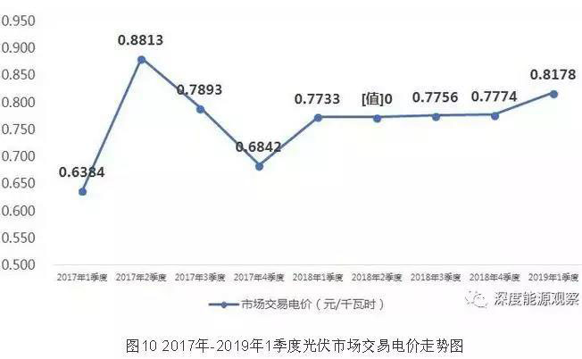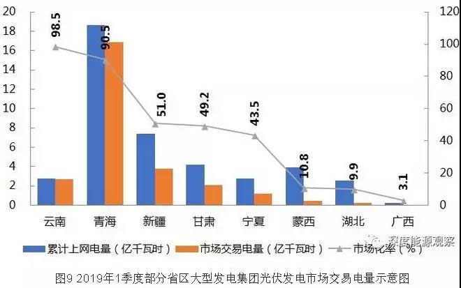 2019年1季度,大型發(fā)電集團(tuán)中光伏發(fā)電市場交易電量規(guī)模較大的省區(qū)分別是青海(16.9億千瓦時(shí))、新疆(3.8億千瓦時(shí))、云南(2.7億千瓦時(shí))和甘肅(2.1億千瓦時(shí)),平均交易電價(jià)(含跨省跨區(qū)外送交易)分別為0.8443元/千瓦時(shí)、0.7332元/千瓦時(shí)、0.7218元/千瓦時(shí)和0.7942元/千瓦時(shí)。光伏發(fā)電上網(wǎng)電量市場化率超過40%的省區(qū)分別為云南(98.5%)、青海(90.5%)、新疆(51%)、甘肅(49.2%)和寧夏(43.5%)。