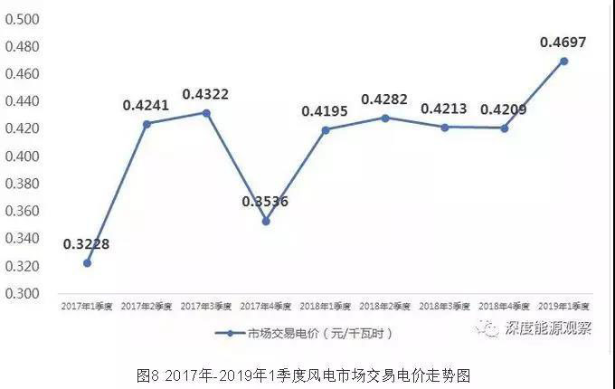 2019年1季度,大型發(fā)電集團(tuán)風(fēng)電機(jī)組累計(jì)上網(wǎng)電量497億千瓦時(shí),占其合計(jì)上網(wǎng)電量的5.7%;風(fēng)電市場交易電量120億千瓦時(shí),風(fēng)電上網(wǎng)電量市場化率為24.1%,其中跨區(qū)跨省交易電量約51億千瓦時(shí),占風(fēng)電市場交易電量的比重為42.3%。