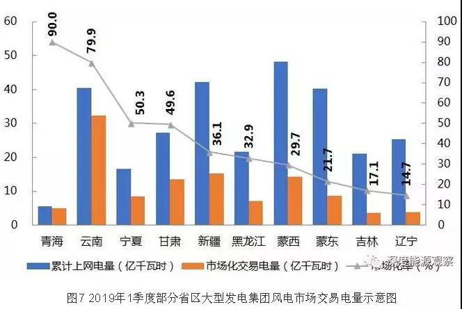 2019年1季度,大型發(fā)電集團(tuán)風(fēng)電市場交易電量規(guī)模較大的省區(qū)分別是云南(32.4億千瓦時(shí))、新疆(15.2億千瓦時(shí))、蒙西(14.3億千瓦時(shí))和甘肅(13.5億千瓦時(shí));風(fēng)電上網(wǎng)電量市場化率超過40%的省區(qū)分別是青海(90%)、云南(79.9%)、寧夏(50.3%)和甘肅(49.6%),其平均交易電價(jià)(含跨省跨區(qū)送出交易電量電價(jià))分別為0.5267元/千瓦時(shí)、0.5265元/千瓦時(shí)、0.5729元/千瓦時(shí)和0.3834元/千瓦時(shí)。