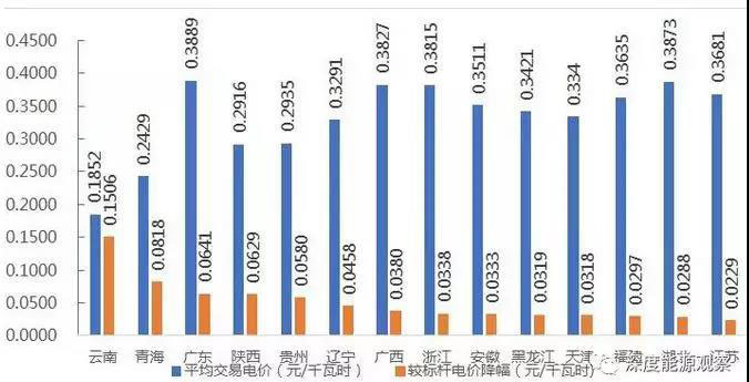 從分省煤電交易價(jià)格來看,與標(biāo)桿電價(jià)比較降幅超過0.1元/千瓦時(shí)的省份是云南省,其市場交易平均電價(jià)分別為0.1852元/千瓦時(shí)與標(biāo)桿電價(jià)相比降幅為0.1506元/千瓦時(shí)。其次,降幅超過0.05元/千瓦時(shí)的省區(qū)有青海、廣東、陜西和貴州,其交易平均電價(jià)分別為0.2429元/千瓦時(shí)、0.3889元/千瓦時(shí)、0.2916元/千瓦時(shí)、0.2935元/千瓦時(shí)。