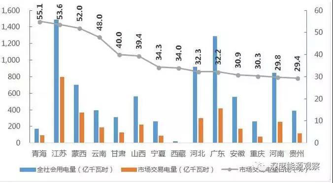 分省來看,市場交易電量占全社會(huì)用電量比重排序前三名的省區(qū)是青海(55.1%)、江蘇(53.6%)、蒙西(52.0%);電力市場交易電量規(guī)模排序前三名的省區(qū)分別是江蘇(799億千瓦時(shí))、廣東(415億千瓦時(shí))和山東(400億千瓦時(shí));省間外受電市場交易電量排序前三名的省區(qū)分別是江蘇(123億千瓦時(shí))、廣東(116億千瓦時(shí))、和山東(97億千瓦時(shí))。