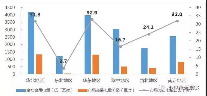 分區(qū)域市場來看,華北、華東區(qū)域市場交易電量規(guī)模分別為1330億千瓦時(shí)、1308億千瓦時(shí),兩個(gè)區(qū)域的市場交易電量規(guī)模占全國市場交易電量的比重達(dá)到了60%。華東、南方、華北三個(gè)區(qū)域的全社會(huì)用電量市場化率都超過了30%。
