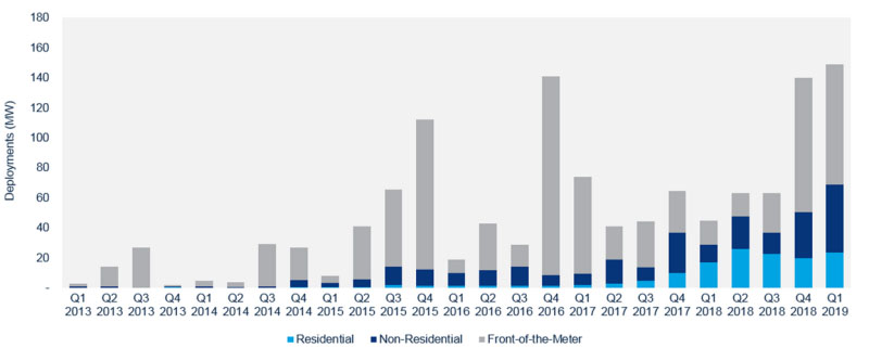 Wood Mackenzie公司發(fā)布的2019年第二季度調(diào)查報(bào)告指出,美國(guó)儲(chǔ)能部署增長(zhǎng)主要得益于公用事業(yè)公司增加儲(chǔ)能系統(tǒng)與可再生能源部署所取得的進(jìn)展。