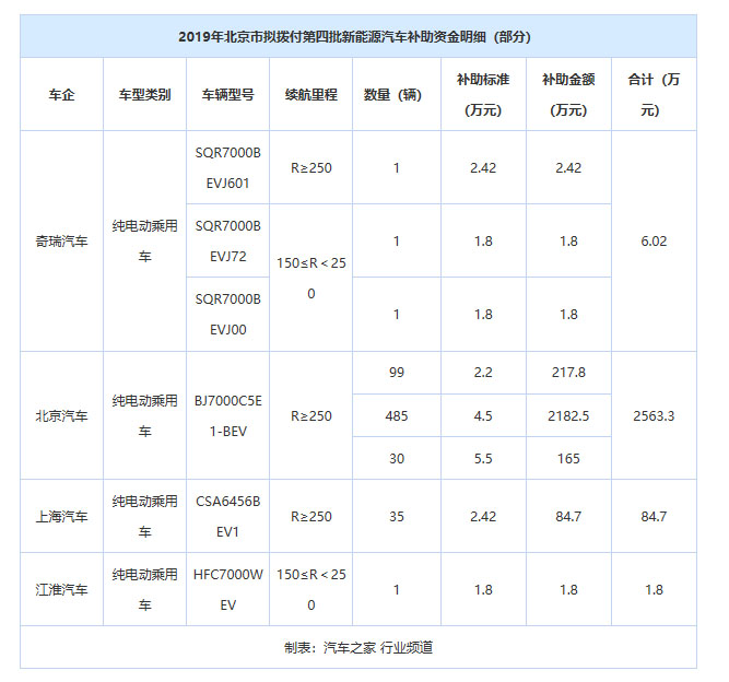 6月11日,北京市經(jīng)信局公示了2019年北京市擬撥付第四批新能源汽車補(bǔ)助資金明細(xì),共涉及7家企業(yè)的748輛新能源汽車,擬撥付資金3441.42萬元。其中乘用車企包括奇瑞、北汽、上汽以及江淮。