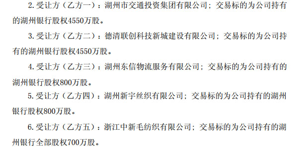 6月14日晚間,美都能源(600175,SH)發(fā)布公告稱,已于當(dāng)日與5家公司簽訂《股權(quán)轉(zhuǎn)讓協(xié)議》,擬出售所持湖州銀行股份有限公司(以下簡稱湖州銀行)的全部股權(quán)(1.14億股,占湖州銀行總股本的12.5%),每股價格為3.5元,交易金額合計3.99億元。上述5家受讓方包括:湖州市交通投資集團(tuán)有限公司、德清聯(lián)創(chuàng)科技新城建設(shè)有限公司、湖州東信物流服務(wù)有限公司、湖州新宇絲織有限公司、浙江中新毛紡織有限公司(如下圖)。