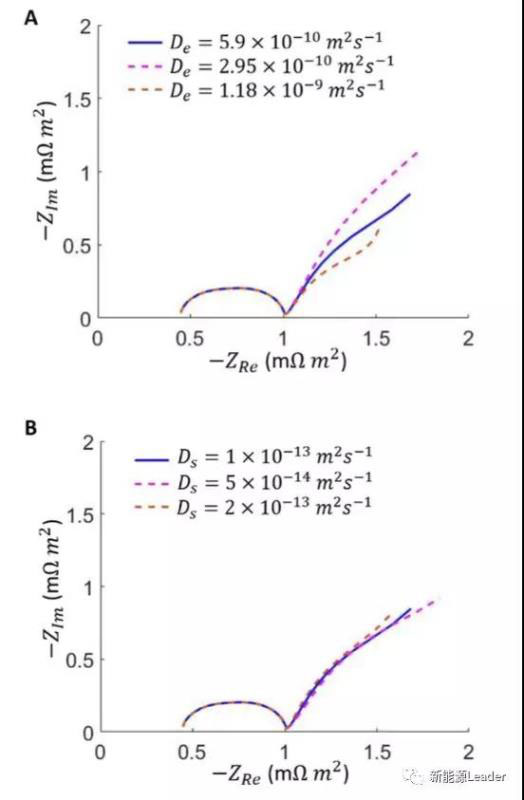 為了分析低頻區(qū)擴(kuò)散阻抗的構(gòu)成,作者在上述模型中分別調(diào)節(jié)電解液和固相擴(kuò)散常數(shù)(增加1倍和減少一半)看對(duì)擴(kuò)散阻抗的影響,根據(jù)下圖所示的擬合結(jié)果可以看到低頻區(qū)的擴(kuò)散阻抗對(duì)電解液擴(kuò)散阻抗的變化更為敏感,因此作者認(rèn)為擴(kuò)散阻抗是由液相擴(kuò)散主導(dǎo)的,但是小編認(rèn)為由于電解液的擴(kuò)散系數(shù)比固相擴(kuò)散系數(shù)高4-5個(gè)數(shù)量級(jí),這里液相擴(kuò)散系數(shù)的變化數(shù)值是固相擴(kuò)散的數(shù)千倍,自然模型對(duì)于液相擴(kuò)散系數(shù)變化更為敏感,但是實(shí)際中液相擴(kuò)散系數(shù)是否會(huì)有這么大的變化還需要進(jìn)一步的驗(yàn)證。