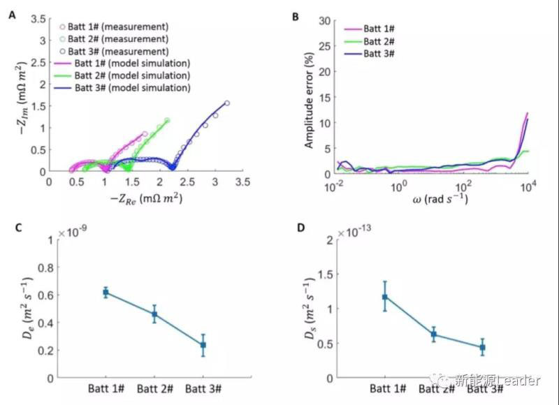 利用上述的多孔電極模型,作者對(duì)三只電池的EIS曲線進(jìn)行了仿真,仿真結(jié)果如下圖A所示,可以看到仿真結(jié)果可以與實(shí)驗(yàn)結(jié)果完美符合,在大部分的頻率范圍內(nèi)誤差在5%以內(nèi),僅在高頻區(qū)由于電感的存在使得誤差有所增加。