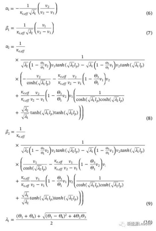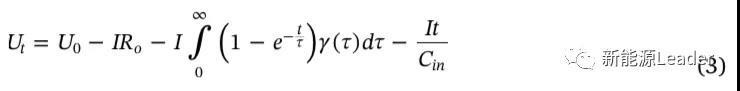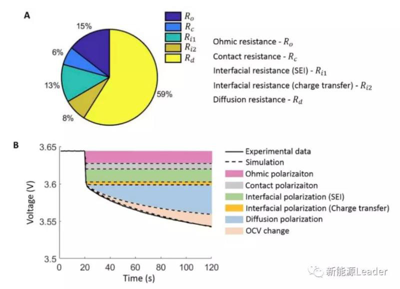 下圖展示了鋰離子電池中不同阻抗類型對(duì)于鋰離子電池阻抗的貢獻(xiàn)比例(25℃,50%SoC),可以看到Li+的擴(kuò)散阻抗Rd占比最大,達(dá)到59%,隨后是歐姆阻抗Ro的15%,然后是Li+在SEI膜中的擴(kuò)散阻抗Ri1的13%,然后是界面電荷交換阻抗Ri2的8%,最小的為接觸阻抗Rc的6%。根據(jù)下式3作者計(jì)算了在恒流放電的過(guò)程中電池中不同阻抗對(duì)鋰離子電池電壓衰降的影響,可以看到歐姆阻抗、接觸阻抗和界面阻抗造成的電壓衰降在幾秒中時(shí)間內(nèi)就已經(jīng)建立,隨后電壓的衰降主要是擴(kuò)散阻抗緩慢建立的過(guò)程。