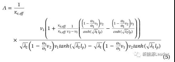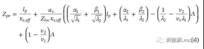 從上面的分析不難看出擴(kuò)散阻抗Rd在鋰離子電池阻抗增加中的占比最大,而作者認(rèn)為低頻下Li+的擴(kuò)散阻抗主要由兩部分組成:1)Li+在固相活性物質(zhì)中的擴(kuò)散阻抗;2)Li+在電解液中的擴(kuò)散阻抗,為了實(shí)現(xiàn)對(duì)這兩種擴(kuò)散阻抗的區(qū)分,作者采用了多孔電極模型的方式對(duì)電極的阻抗行為進(jìn)行分析,多孔電極的阻抗模型如下式4所示。