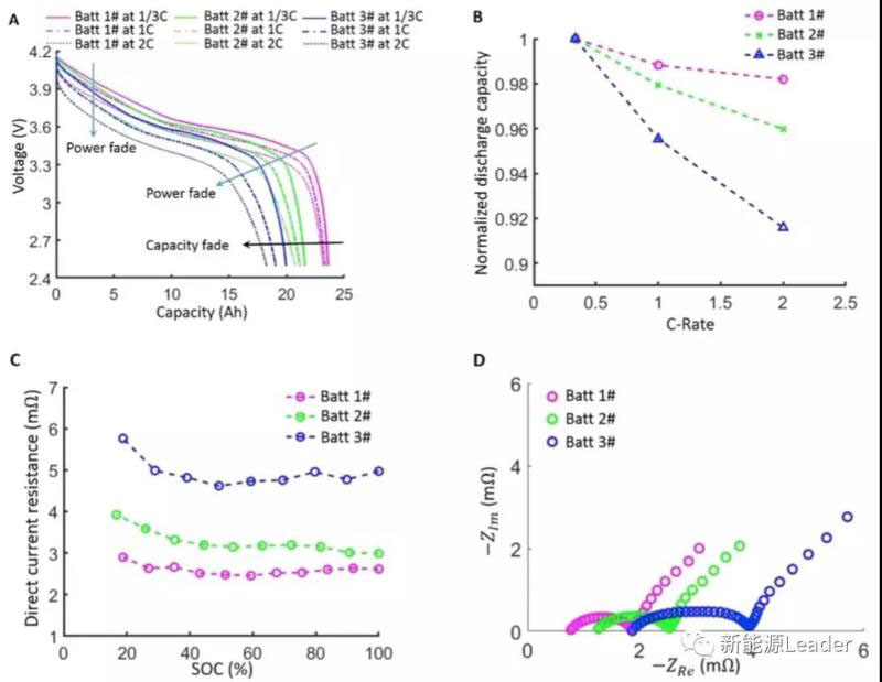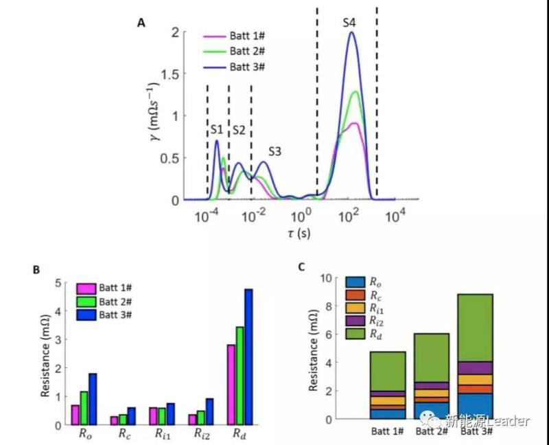下圖a為三只電池在不同倍率下的放電曲線,從圖中能夠看到隨著鋰離子電池衰降程度的增加,其電池容量出現(xiàn)了顯著的衰降,并且電池極化也明顯增加,從下圖c也能夠注意到隨著鋰離子電池老化程度的增加,電池的直流阻抗也出現(xiàn)了顯著的增加,但是由于直流阻抗的特點(diǎn),我們無(wú)法對(duì)不同阻抗類型對(duì)直流阻抗增加的貢獻(xiàn)進(jìn)行區(qū)分。