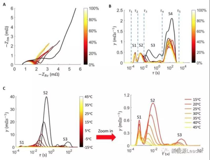 為了進(jìn)一步確定S1和S2的阻抗類型,作者又對(duì)不同溫度下電池的DRT進(jìn)行了分析,從下圖能夠S1-S3都與溫度具有很強(qiáng)的相關(guān)性,但是相比于S2,S1的溫度相關(guān)性比較低,因此作者認(rèn)為S1主要反應(yīng)的是接觸阻抗,由于S3與SoC之間有密切的關(guān)系,因此S3可以認(rèn)為是電荷交換阻抗Ri2,而S2與SoC關(guān)系較弱,與溫度關(guān)系密切,因此S2為L(zhǎng)i+擴(kuò)散通過(guò)SEI膜的阻抗Ri1。