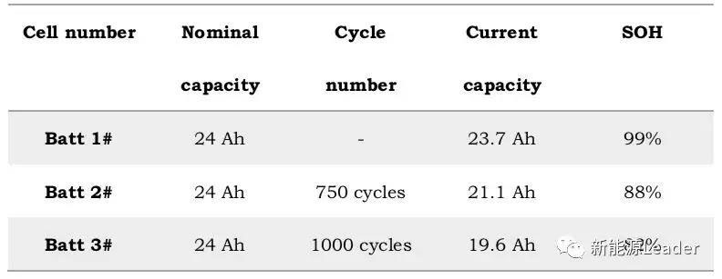 實(shí)驗(yàn)中作者采用了三只NCM111/石墨軟包電池,電池容量為24Ah,其中1#電池未進(jìn)行循環(huán),2#電池在45℃下循環(huán)750次,3#電池在45℃下循環(huán)1000次,電池的基本信息如上表所示。