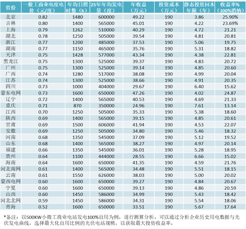 小微工商業(yè)光伏電站的用電主體,主要是中小工商企業(yè)主,且主要是民營企業(yè)。該類業(yè)主大多享受一般工商業(yè)電價,即使按照今年兩會“一般工商業(yè)電價再下降10%”的要求,也比大工業(yè)用電價格高。根據(jù)全國各省市一般工商業(yè)電價水平下的投資收益率簡易測算分析,除重慶市外其他地區(qū)的電站靜態(tài)投資回報期都在4到6年間(見下圖)。
