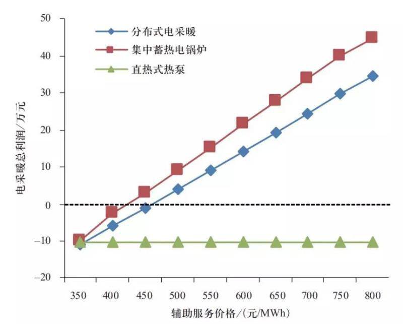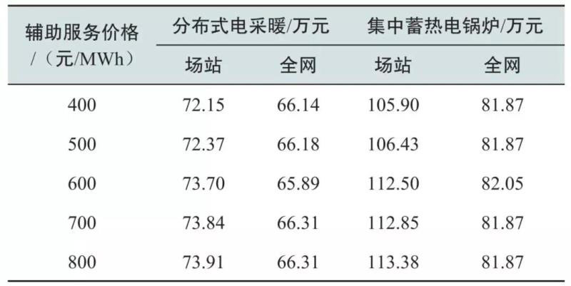 對于分布式電采暖和集中蓄熱式電采暖,其可行輔助服務價格分別為460.1和425.9元/MWh。根據東北電網火電機組深度調峰的出清價格規(guī)定,調峰價格根據調峰深度可以分為0~400元/MWh、400~600元/MWh、600~800元/MWh三檔,可見電采暖的可行價格與火電機組相比具有較大的競爭力。