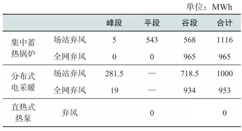 不論是集中式還是分布式電采暖,由于調節(jié)能力制約,其在棄風水平較高的全網棄風條件下,并沒有消納更多的棄風。對比棄風的消納時段,全網棄風條件下,更多的棄風電量集中在電價更低的谷段時間,而在場站棄風條件下,在電價更高的平或峰時段消耗了大量棄風。計算可得,集中蓄熱電鍋爐在場站和全網棄風條件下谷段消納棄風比例分別為50.9%和100%;分布式電采暖在風電場和全網棄風條件下谷段消納棄風比例分別為71.9%和98%。